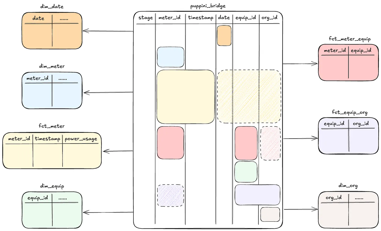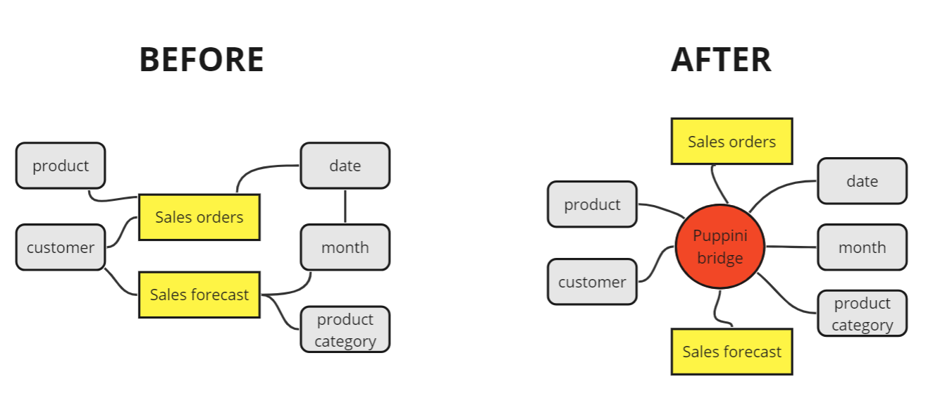 dimensions, bridge and fact with data values Illustration